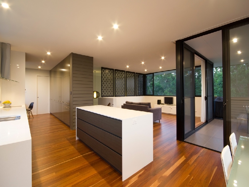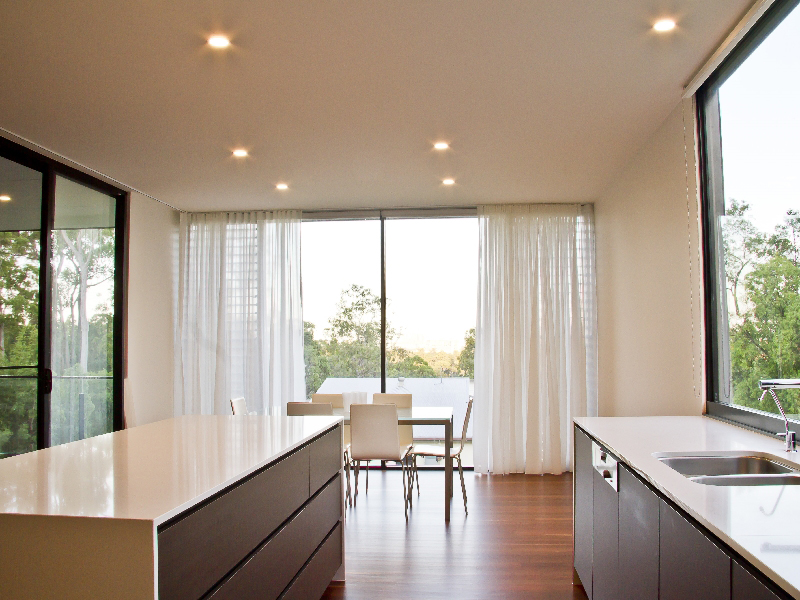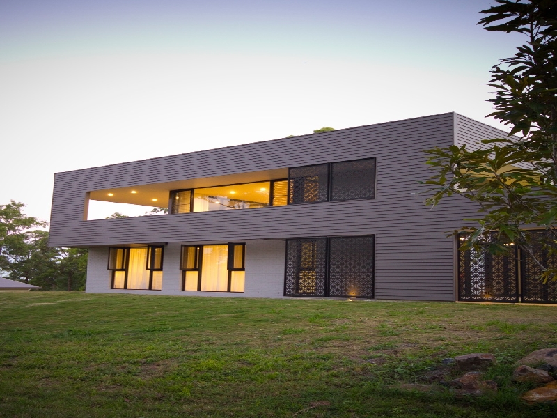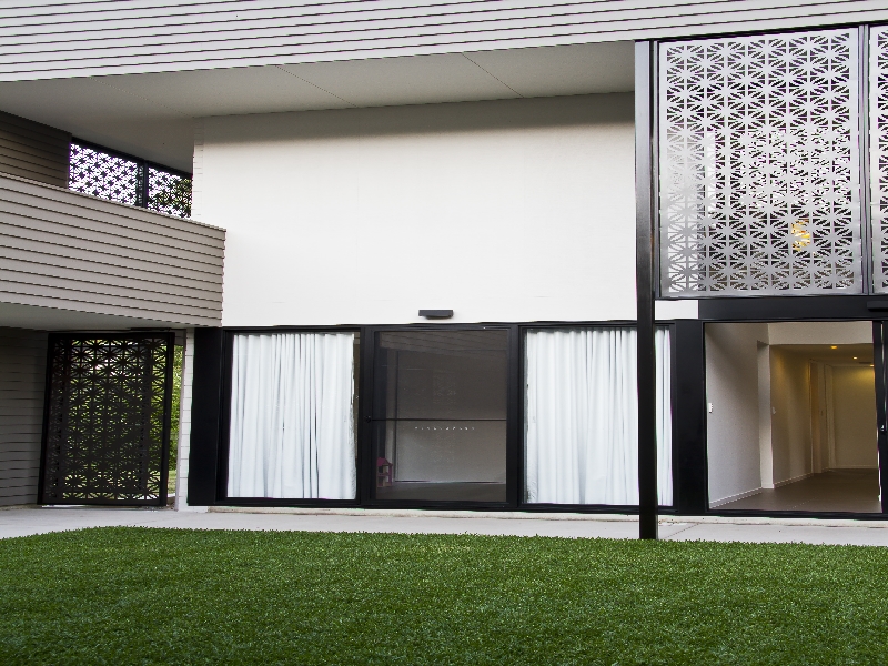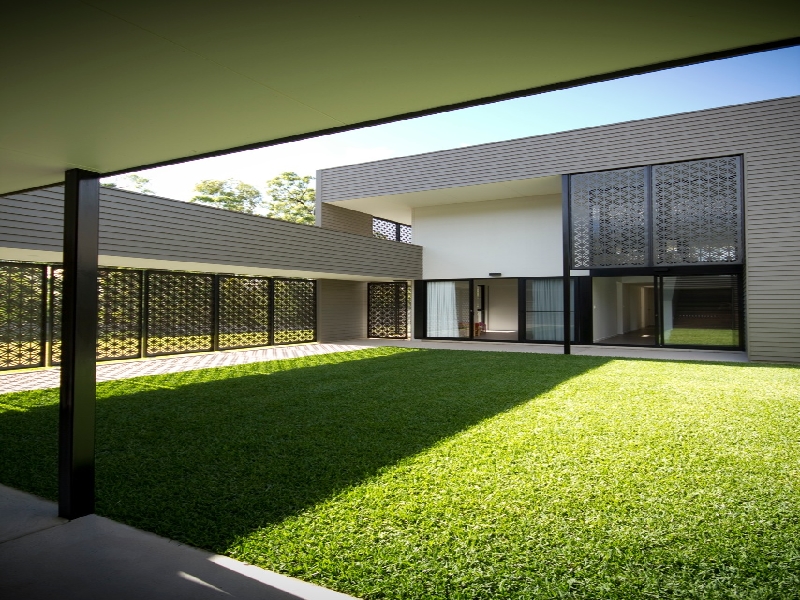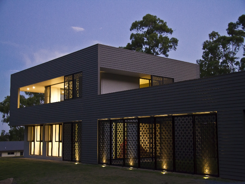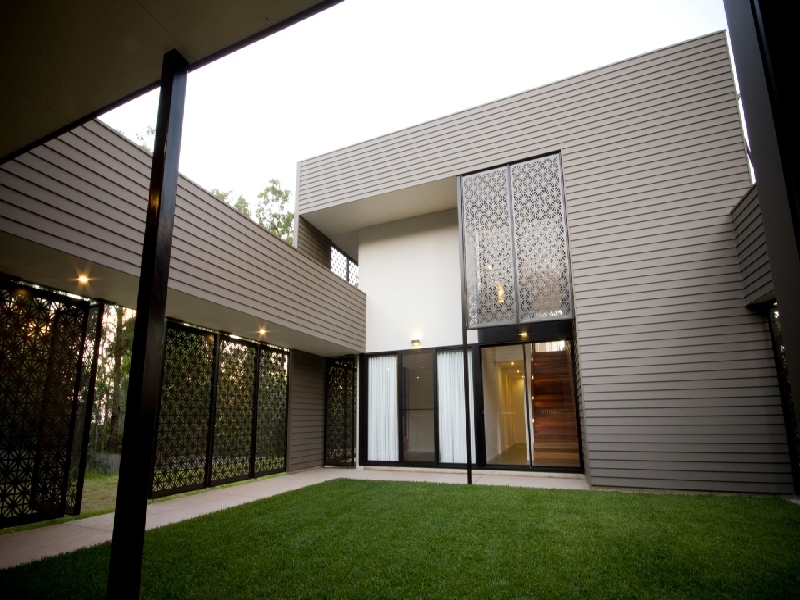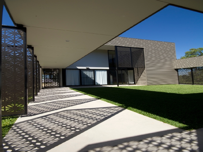 Nestled amongst the gumtrees, on a sloping bushland site with coastal and hinterland views, the residence designed by Jamison Architects essentially comprises of two pods linked by an interesting feature courtyard surrounded by intricate laser cut screens. The courtyard forms a unique entry experience for the residence and will also be enjoyed as an ‘outdoor room’ for play and entertainment.